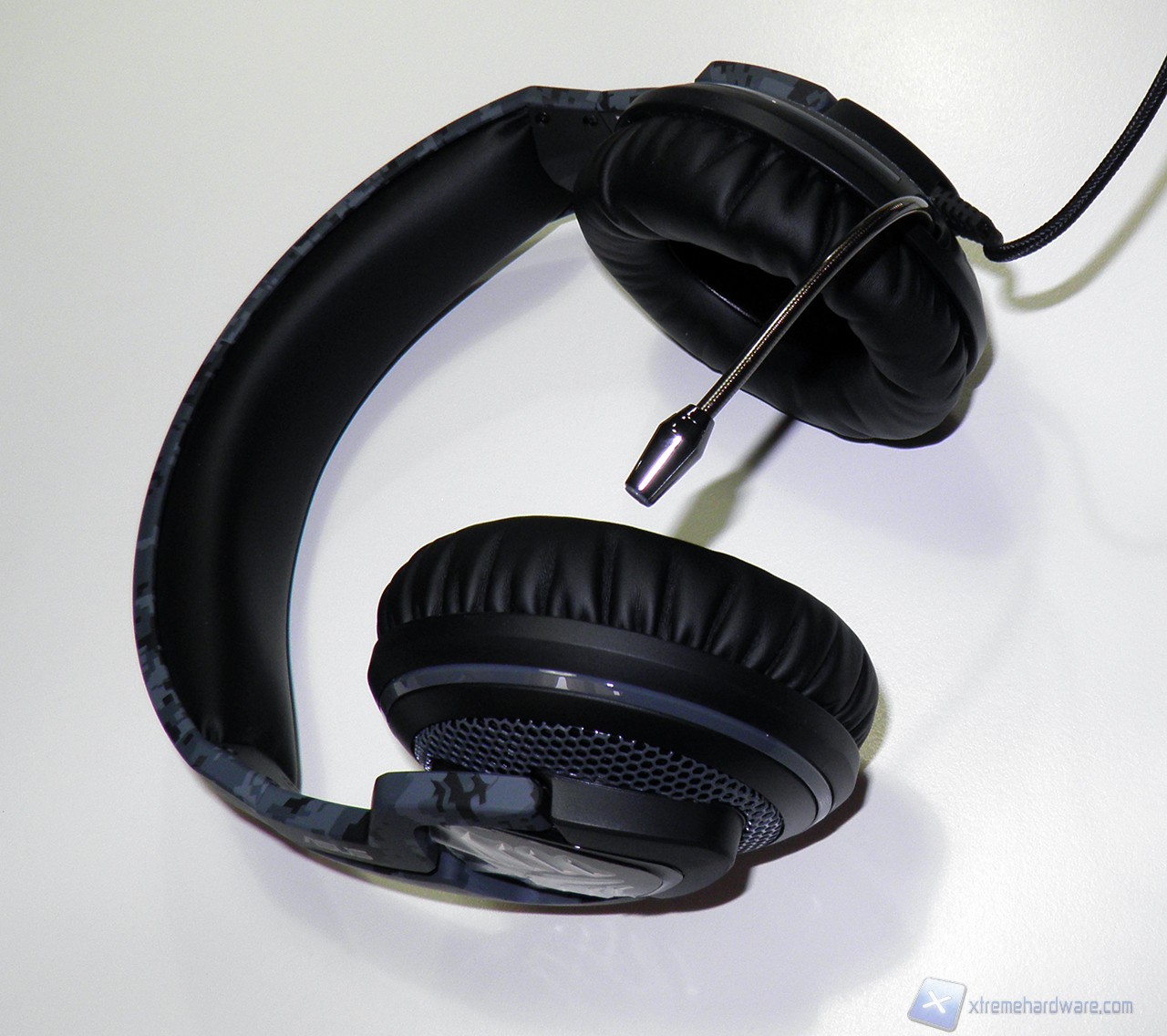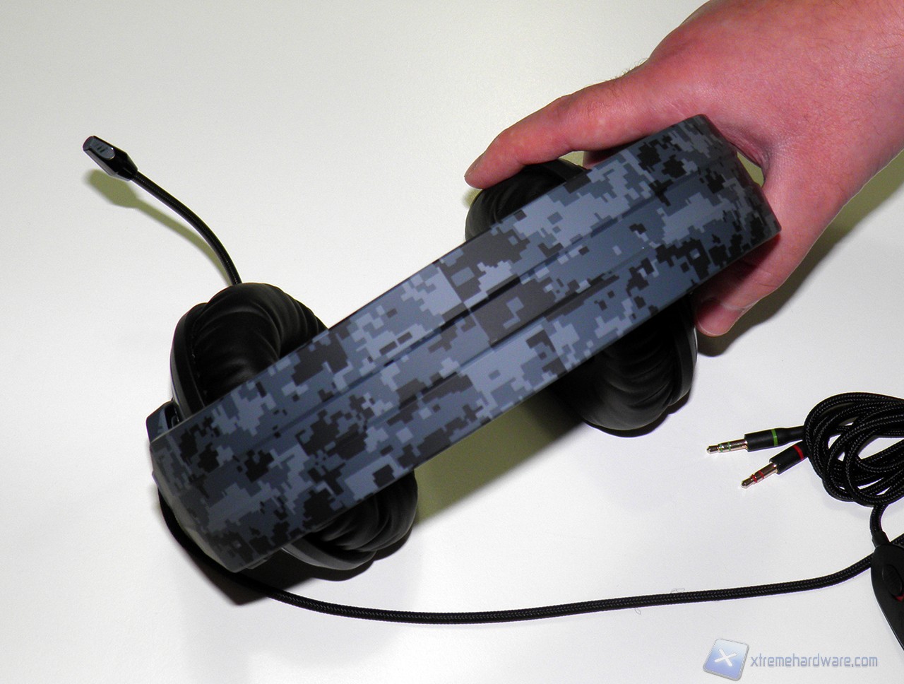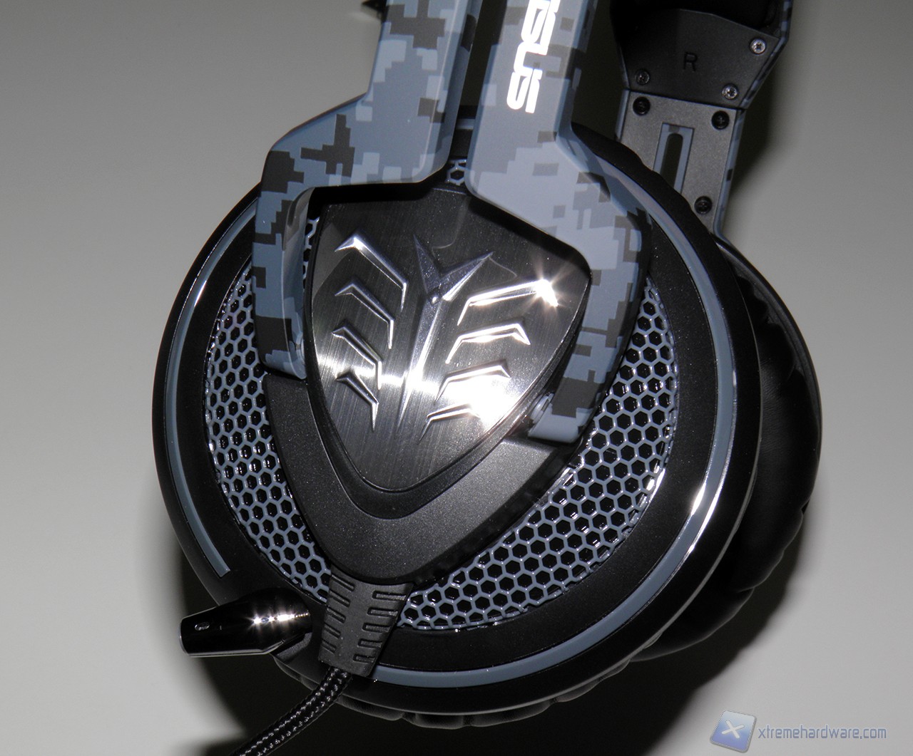 Le ASUS Echelon sono decisamente pregiate ad un primo contatto, la finitura Camo che caratterizza questo nuovo modello, oltre ad essere bella esteticamente, è leggermente gommata e quindi molto piacevole al tatto. Anche qui troviamo due inserti metallici sui padiglioni molto belli da vedere.