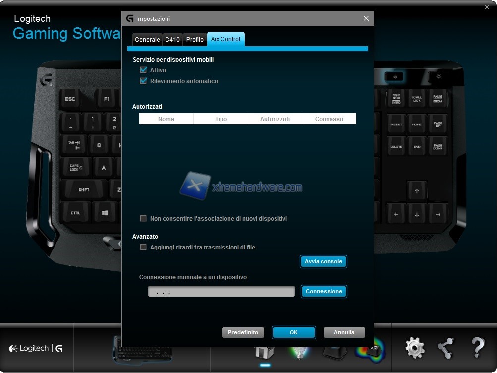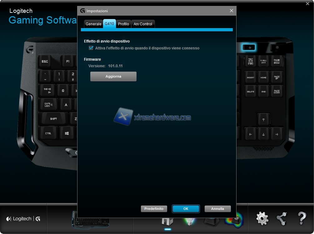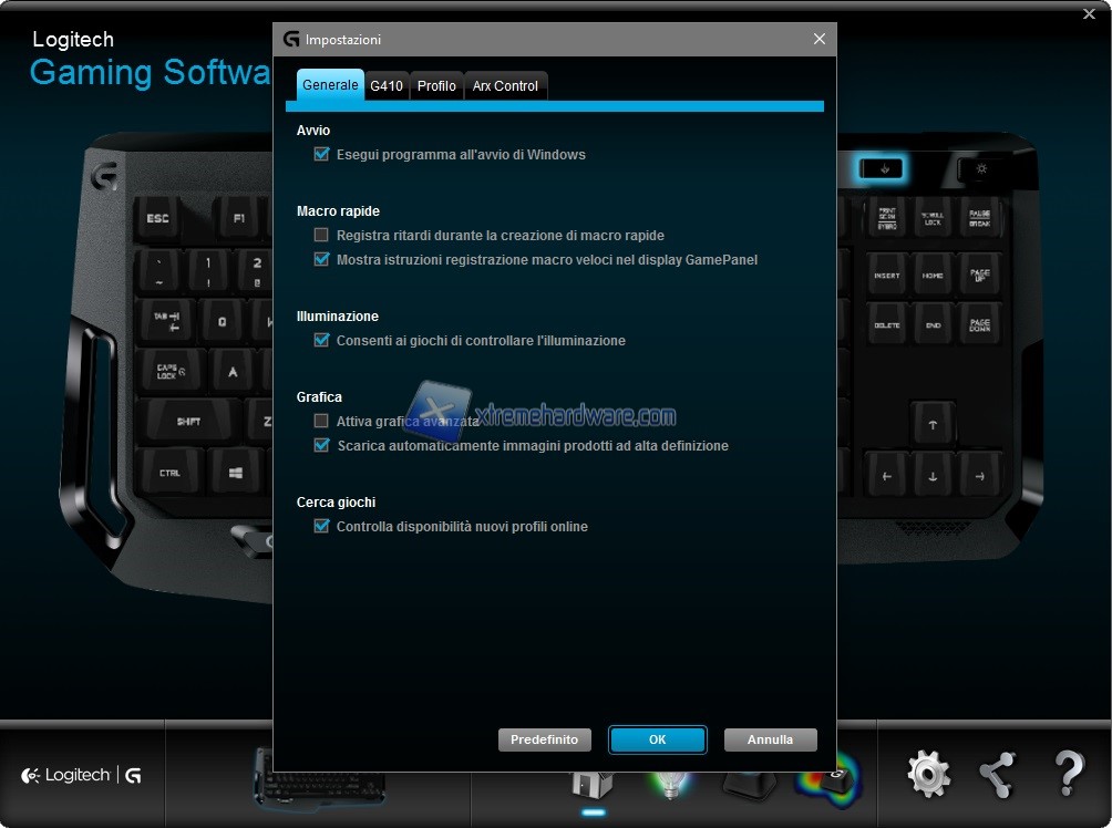 Infine arriviamo ai classici Menù e Sottomenù dai quali possiamo impostare l’avvio del software, controllare eventuali disponibilità di nuovi firmware e molto altro. Essendo dotata la G410 di un supporto per ARX abbiamo anche la possibilità di impostarlo dal software Logitech.