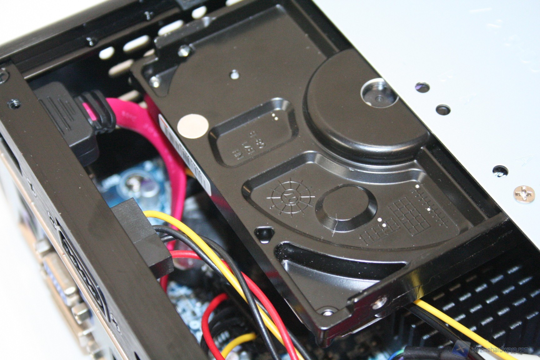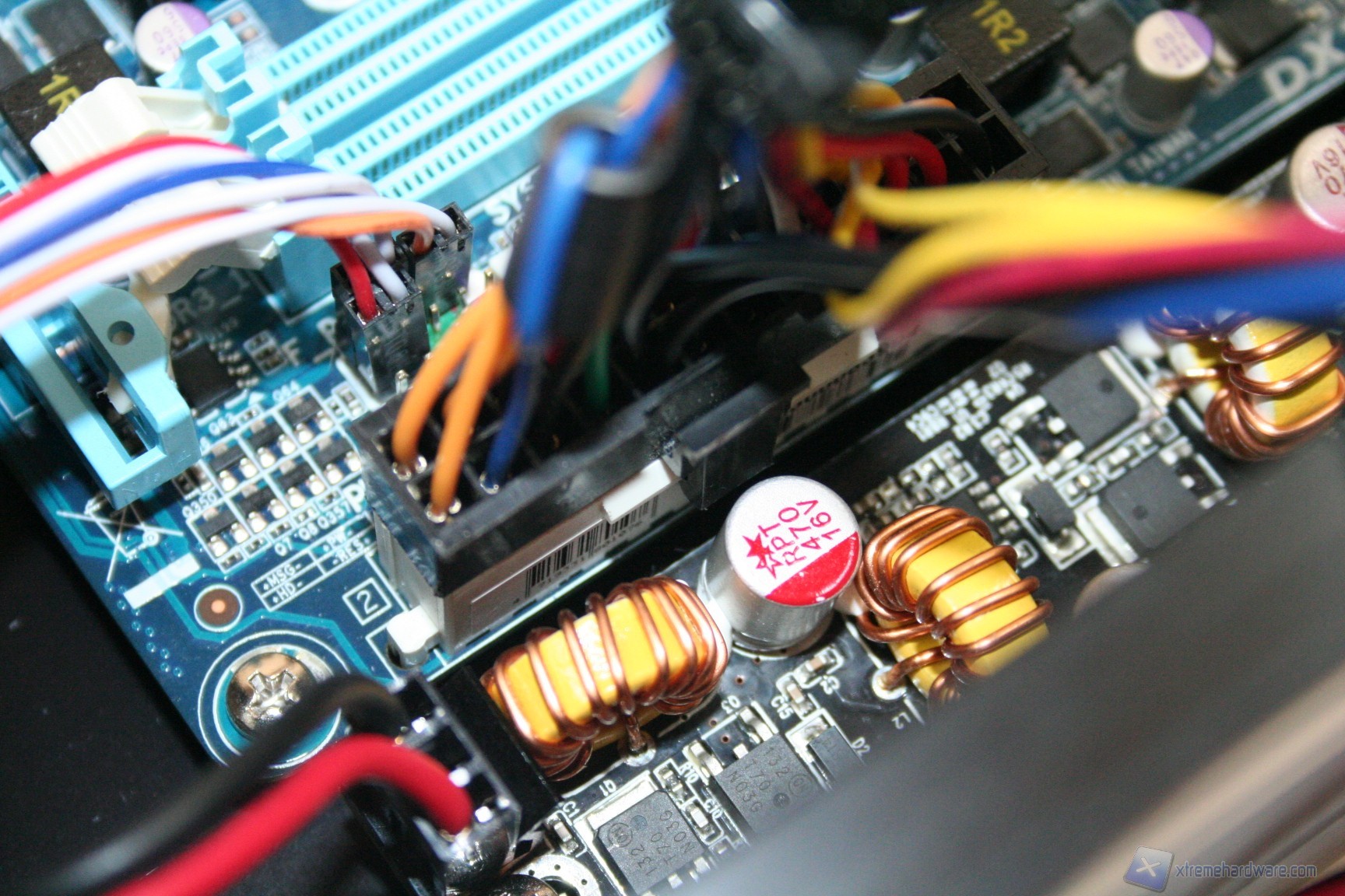 Nelle foto seguenti potete osservare la situazione con un hard disk da 3.5” installato frontalmente e capovolto. Oltre a questo, nell’ultima foto troviamo un particolare degno di menzione ovvero che il connettore di bloccaggio del cavo da 20+4 PIN è pericolosamente vicino ad un condensatore. Fate molta attenzione ed evitate il contatto: