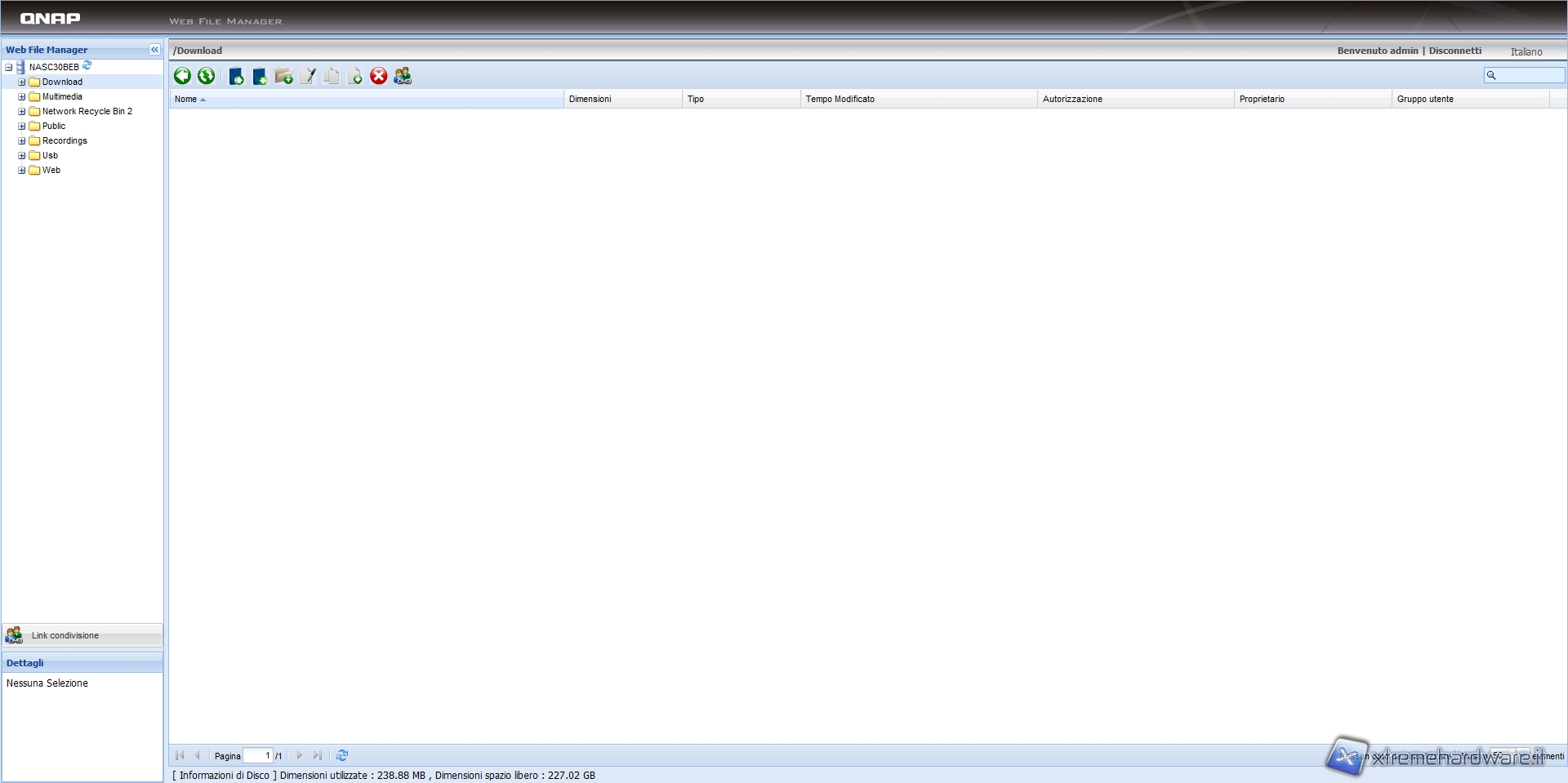 Attraverso il “Web File Manager” è ovviamente possibile scaricare un file sul computer con il quale abbiamo effettuato l'accesso, uploadare un file in una determinata cartella condivisa, cambiare i privilegi degli utenti delle varie cartelle e file, eliminare cartelle e file o semplicemente visualizzarne le proprietà.